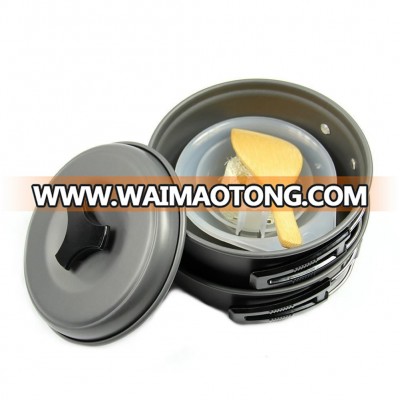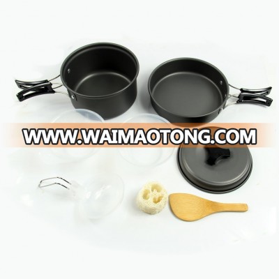 This outdoor cooking set is designed for one or two people. The pot and frying pan are made of anodised aluminum, which makes it solid and light. This cooking set is a kind of non-stick cookware. Foldable handles on pot, frying pan and soup spoon. They can be folded to save space. Small size and portable: All the objects in this cooking set can be stored together in a mesh bag for convenient carry.